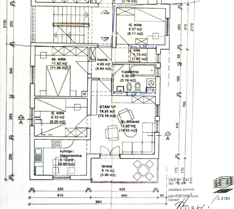 Sastoji se od tri spavaće sobe, prostranog dnevnog boravka, kuhinje s blagovaonicom, kupaonice, hodnika, špajze i velike terase. Glavna spavaća soba ima bračni krevet dimenzija 180 × 200 cm i komodu. Druga soba je uređena kao radna soba s radnim stolom i policama, dok treća soba služi kao garderoba i sadrži veliki trokrilni ormar s kliznim vratima. Dnevni boravak opremljen je trosjedom i dvjema foteljama.
