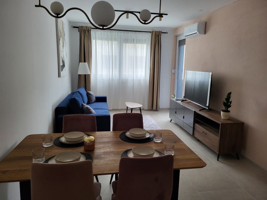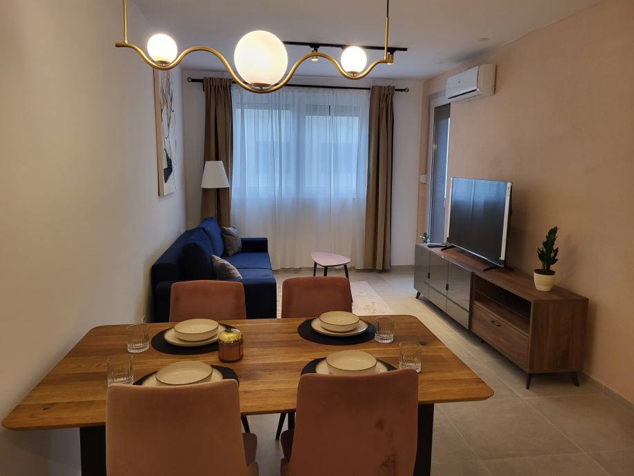 Stan je potpuno namješten i opremljen, s namještajem rađenim po mjeri i kvalitetnim kuhinjskim aparatima. Perlica rublja smještena je u kupaonici. Čeka se još samo ugradbeni ormar za hodnik koji bi trebao biti postavljen do kraja siječnja.