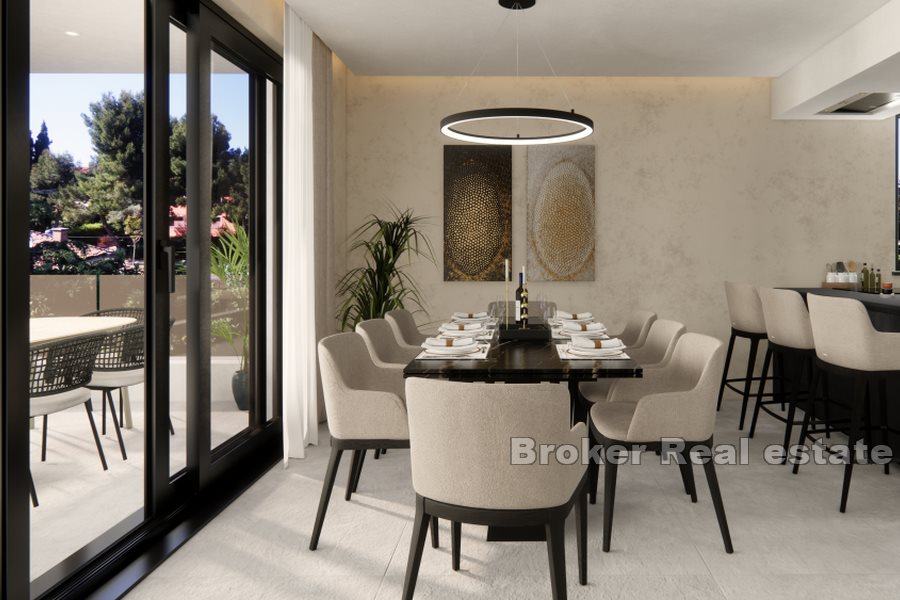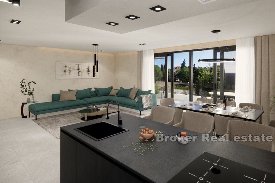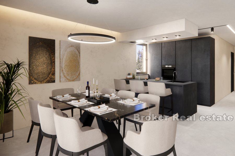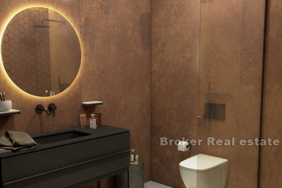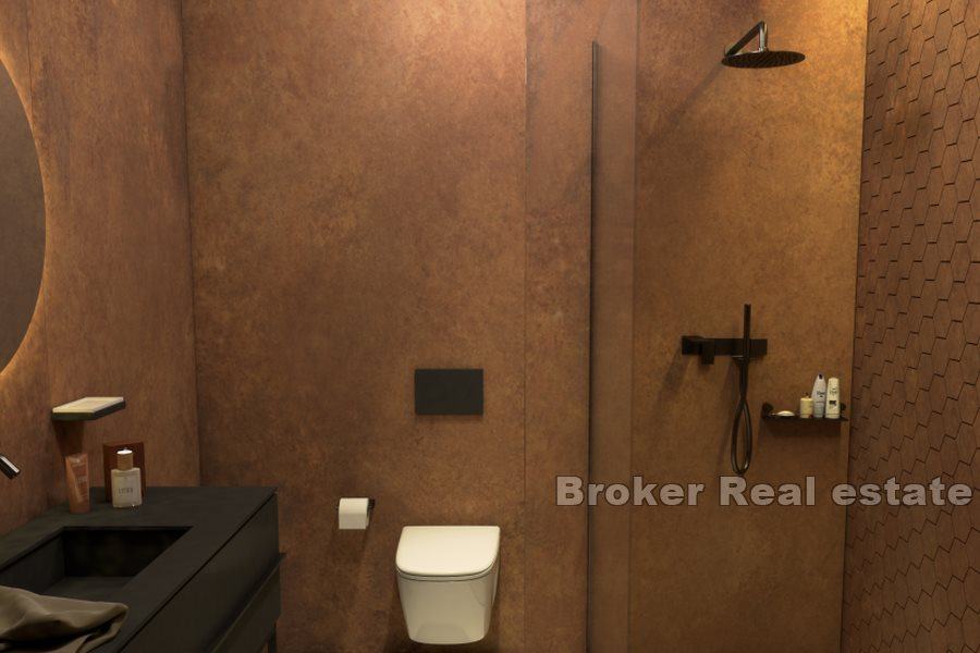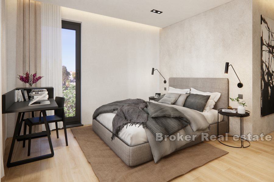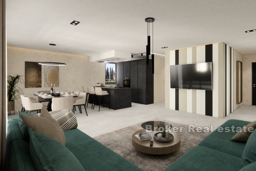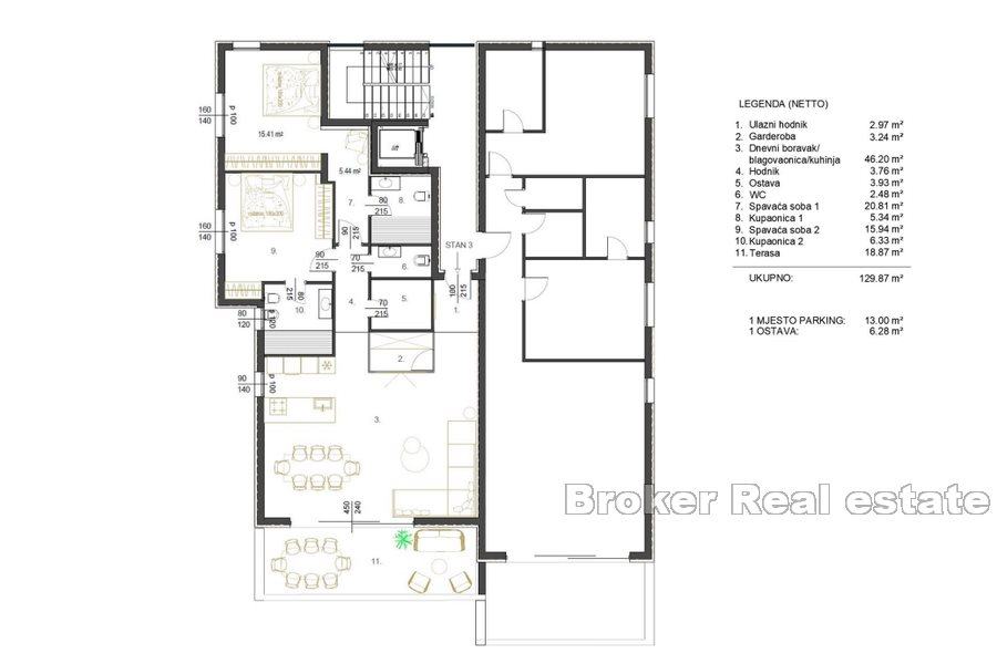 Sastoji se od hodnika, prostranog dnevnog boravka s kuhinjom i blagovaonom te izlazom na natkrivenu terasu od 16.29 m2, dvije prostrane spavaće sobe svaka s vlastitom kupaonom, dodatnog WC-a, ostave (površina unutarnjeg prostora 102.54 m2 + natkrivena terasa 16.29 m2). Stanu pripada garaža od 13 m2 i ostava od 6.40 m2.