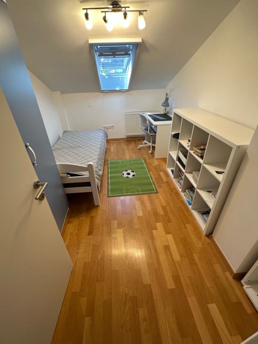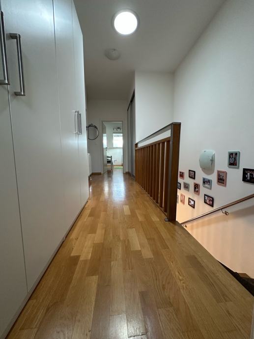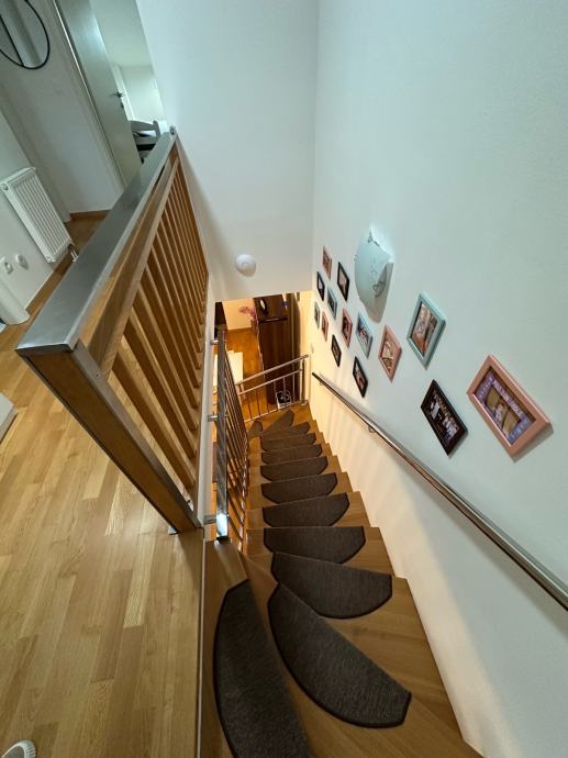iz dnevnog boravka je izvedeno stepenište(inox ograda sa drvenim gazištima)koje je poveznica za potkrovlje u kojem se nalaze:spavaća soba 1 sa ugradbenim ormarom po mjeri,hodnik,kupaonica sa kadom i wc-om,spavaća soba 2,spavaća soba 3.