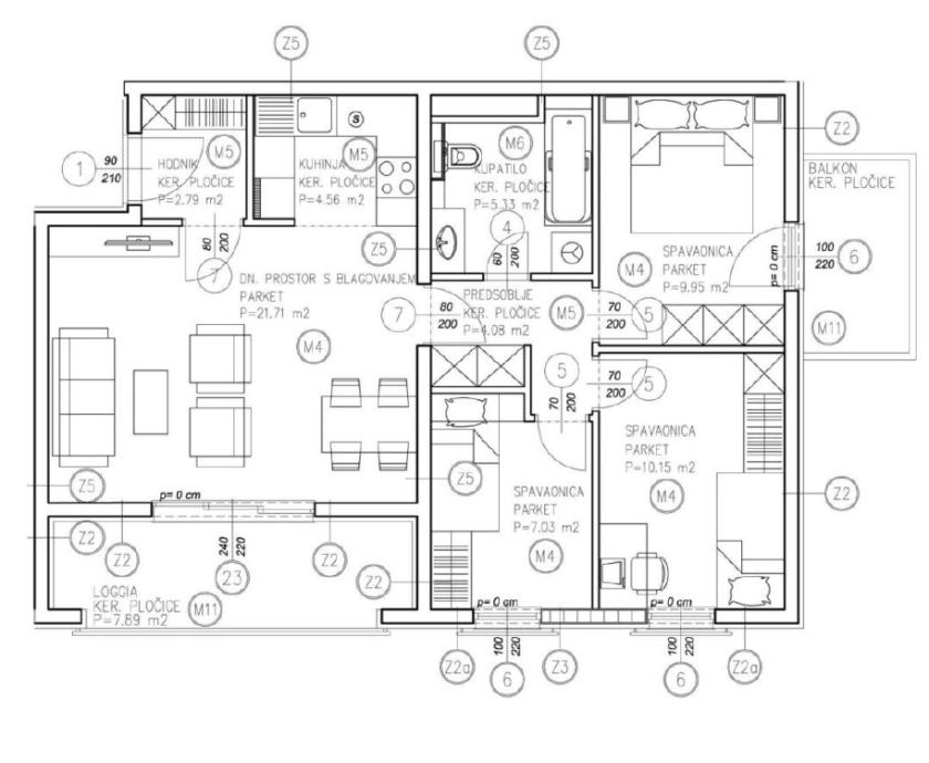 Stan se sastoji od: tri spavaće sobe, hodnika, predsoblja, kupatila, dnevnog prostora sa blagovaonicom, kuhinje, loggia i balkona.