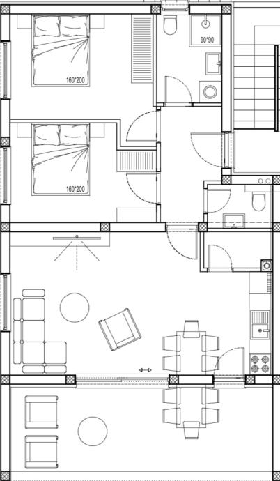 Sve prostorije imaju prozore s komarnicima i električne rolete. Na lođu vode vrata iz kuhinje i velika klizna stijena iz dnevnog boravka. Kroz kupaonski prozor pruža se pogled na maslinike i vinograde Dalmatinske zagore, a s lođe pogled na more i otoke.
