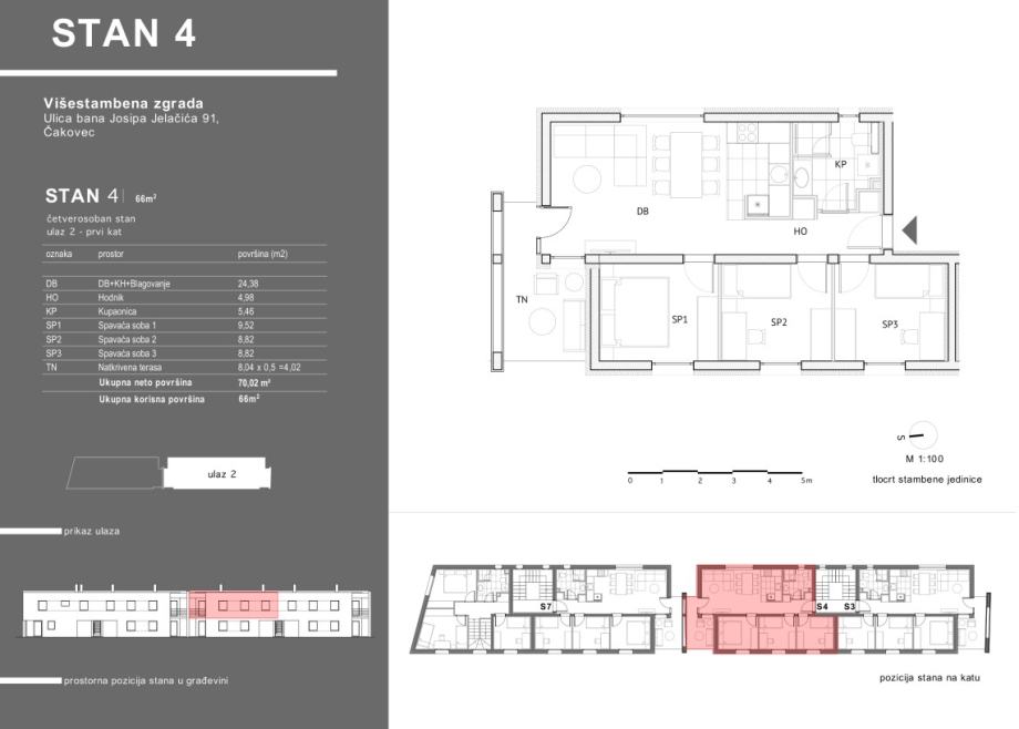 Na raspolaganju su četverosobni stanovi od 66,00m2 te jedan dvoetažan četverosobni stan od 91,44m2