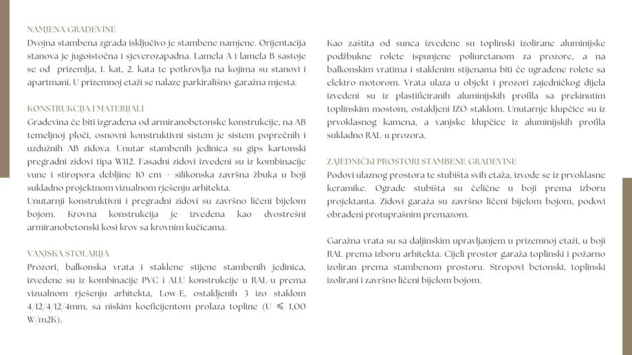 Prozori, balkonska vrata i staklene stijene stambenih jedinica, izvedene su iz kombinacije PVC i ALU konstrukcije u RAL-u prema vizualnom rješenju arhitekta, Low-E, ostakljenih 3 izo staklom 4/12/4/12/4mm, sa niskim koeficijentom prolaza topline (U ≤ 1,00 W/m2K).