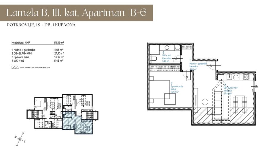 Dvojna stambena zgrada isključivo je stambene namjene. Orijentacija stanova je jugoistočna i sjeverozapadna. Lamela A i lamela B sastoje se od prizemlja, 1. kat, 2. kata te potkrovlja na kojima su stanovi i apartmani. U prizemnoj etaži se nalaze parkirališno-garažna mjesta.