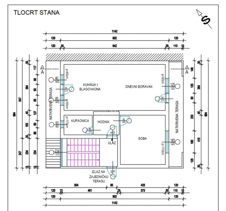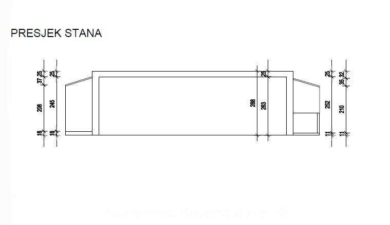 Stan se sastoji od prostrane dnevne sobe povezane s trpezarijom i kuhinjom. Ostatak čine spavaća soba, kupaonica, ulaz i ostava u podrumu. Zanimljivost stana su dvije natkrivene terase- istočna i zapadna s lijepim pogledom na grad, istočna ima pristup iz kuhinje a zapadna iz dnevnog boravka.( ne ulaze u kvadraturu stana) Dodatna vrijednost je lagan pristup velikoj zajednočkoj terasi na vrhu zgrade.