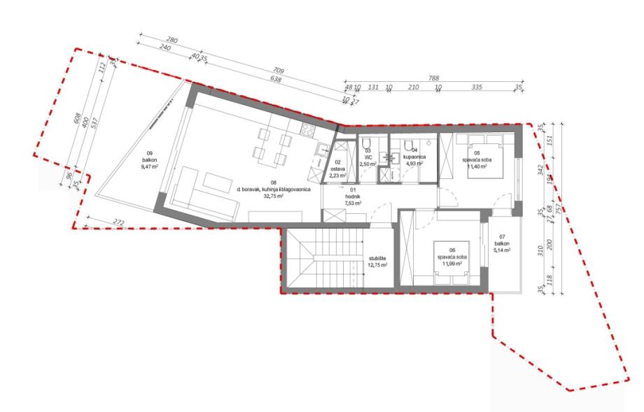 Sastoji se od hodnika, ostave, wc-a, kupaonice, spavaće sobe, spavaće sobe, balkona, dnevne sobe, kuhinje i blagovaonice te balkona.