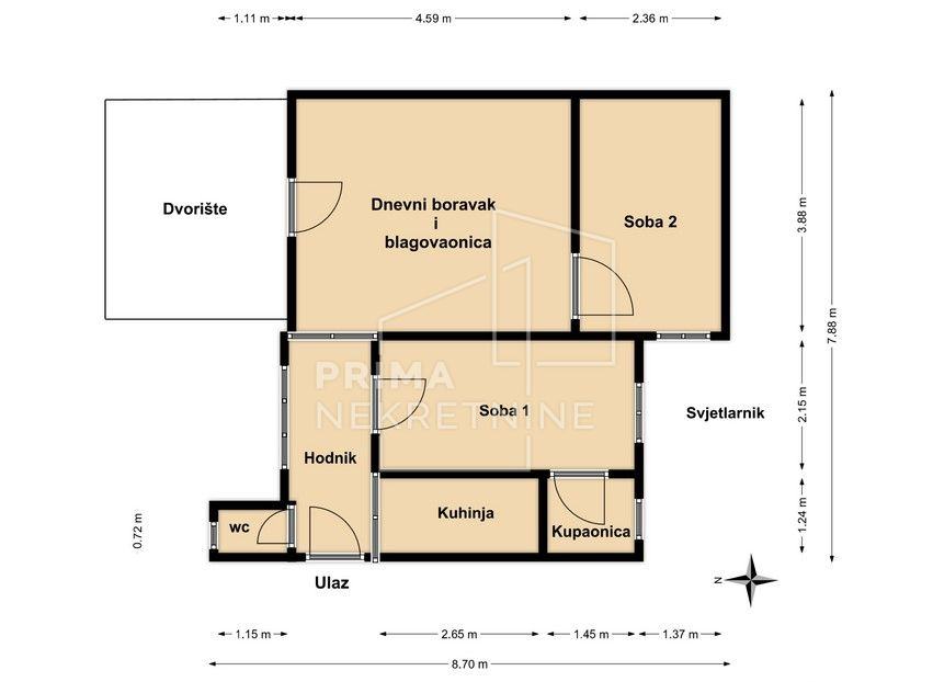Sastoji od dnevnog boravka s blagovaonicom, dvije spavaće sobe, kuhinje, kupaonice i odvojenog wc-a.