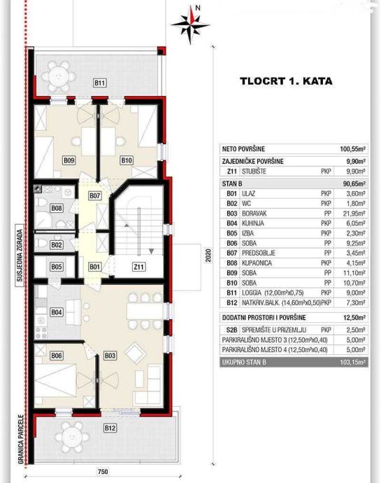 Prodaje se četverosobni stan neto korisne površine 90,65 m2 na 1. katu zgrade, a sastoji se od: