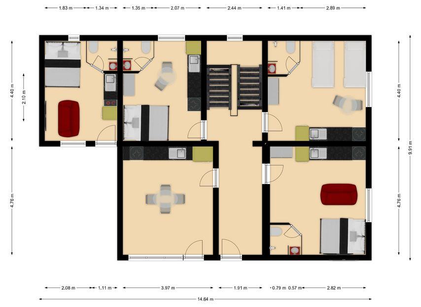Multiple studio apartments for 4 people with bunk beds, a fully equipped kitchen, and a bathroom