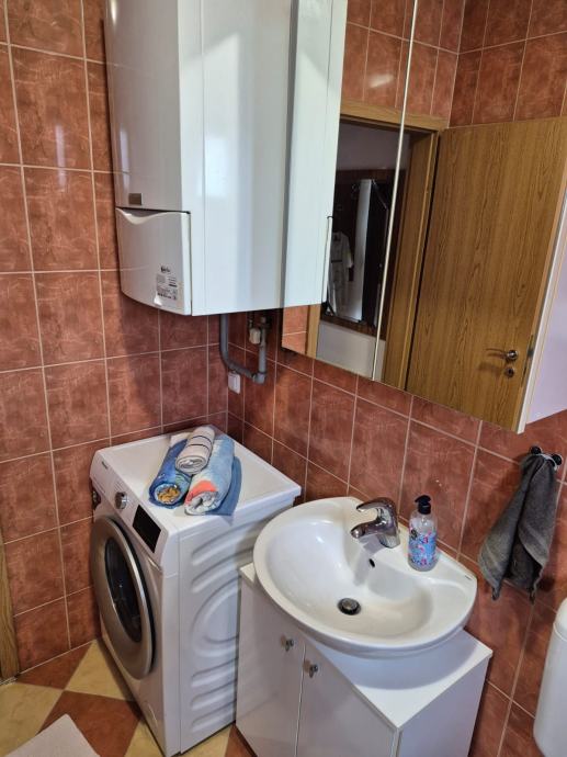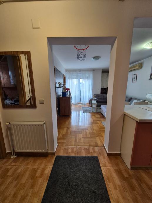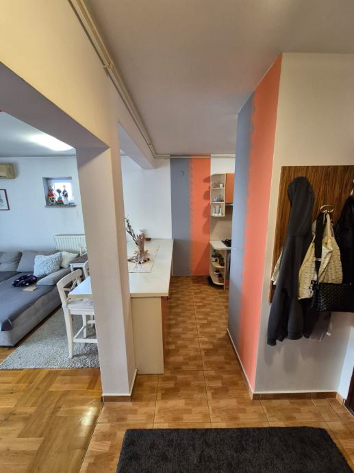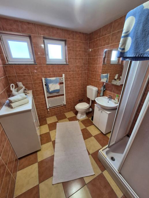 Ulaza iz donjeg dijela stana i ulaza iz stubišta s protuprovalnim vratima, hodnika, dvije namještene spavaće sobe, velike kupaone s tuš kabinom i wc-om.