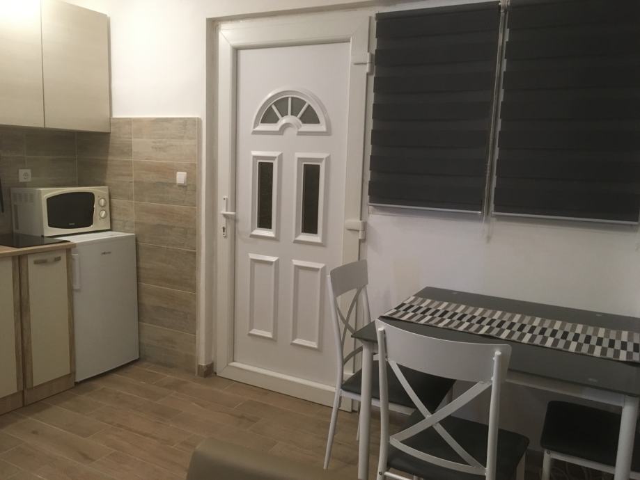 Stan se nalazi u Kotorskoj 42, dostupan je za trajni najam na ugovor ovjeren kod javnog bilježnika. Plaća se polog 450 eura i prva najamnina prilikom ulaska. Minimalni najam na godinu dana. Garsonijera se sastoji od kupatila, mini kuhinje i sobe. Ispred je mala terasa. Grijanje je preko klime tako da je i po ljetu prostor klimatiziran.