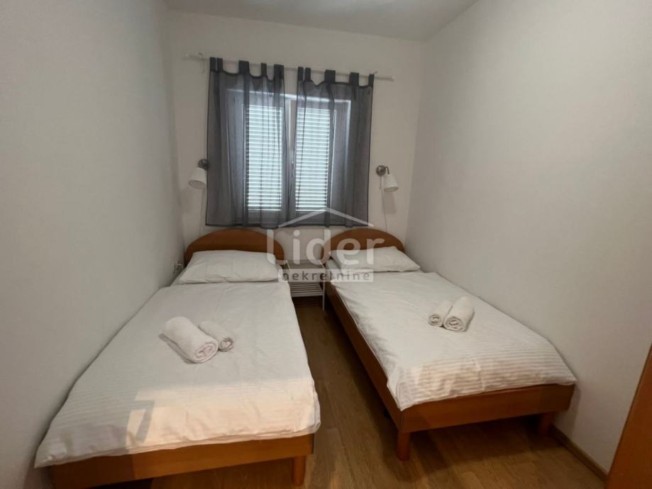 Stan se nalazi na prvome katu kuće sa tri stana, a ulaz i parkirališno mjesto su na razini ulice. Kuća je smještena u mirnoj, slijepoj ulici bez gradske buke i prometa, te je u neposrednoj blizini plaže, sportsko rekreacijskog kompleksa hotela Omorike i Adrenalin parka. Duga Mall, Lidl i Super Konzum su također u neposrednoj blizini.