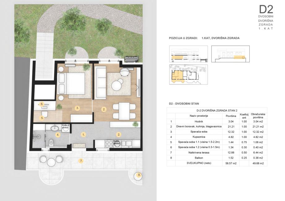 Zgrada je orjentirana istok/zapad. Nekretnina se sastoji od 2 zgrade povezane ogromnom terasom koja je na korištenju svim stanovima. Zgrada ima lift, video portafon, pristup osobama sa invaliditetom, satelitski i antenski sustav.