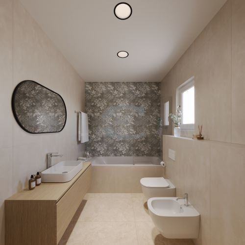 Sastoji se od tri spavaće sobe, master kupaonice s kadom, manje kupaonice s tuš kadom,