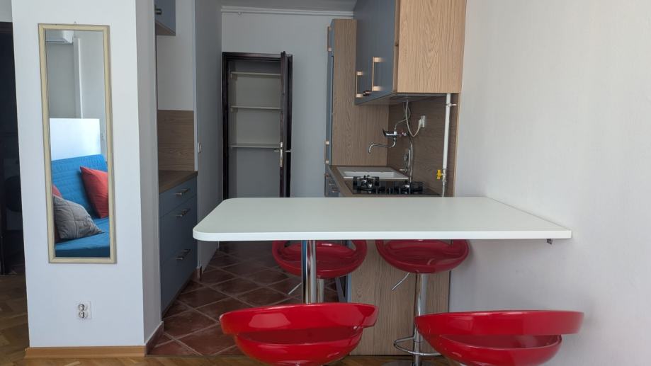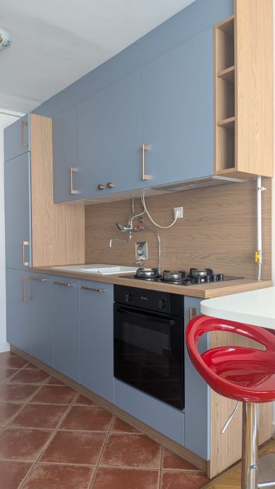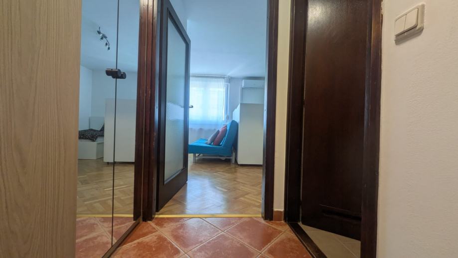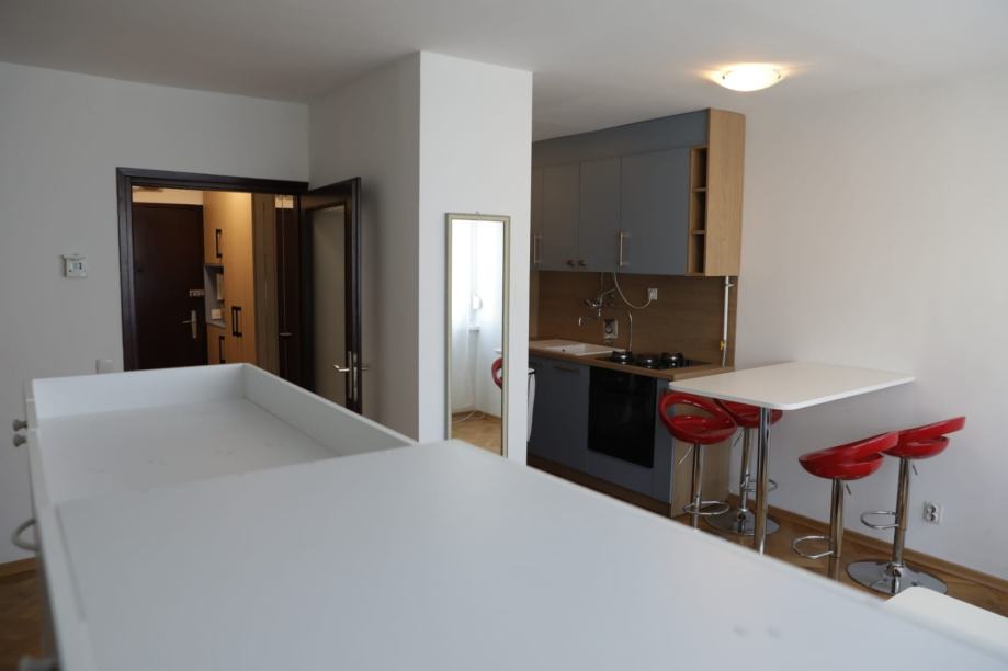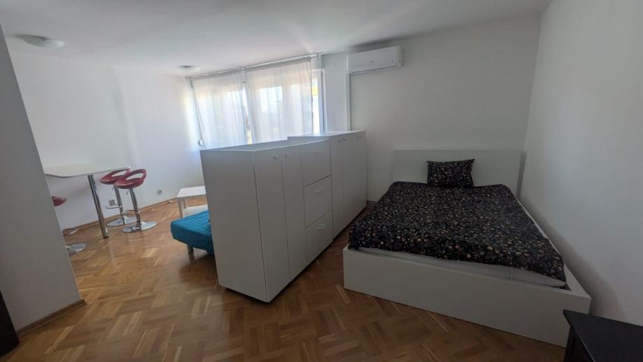 Stan se sastoji od hodnika s ugrađenim oramarom, kupaone, kuhinje sa smočnicom, spavaćeg dijela i dnevnog boravka s blagovaonskim stolom, što je odvojeno pregradnim ormarima. Ima klimu, perilicu suđa i rublja, te po potrebi tv i radni stol.