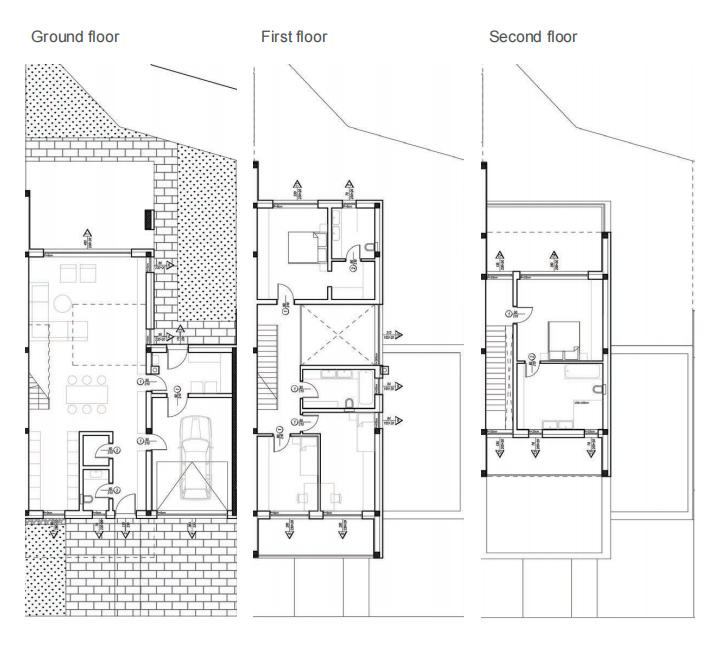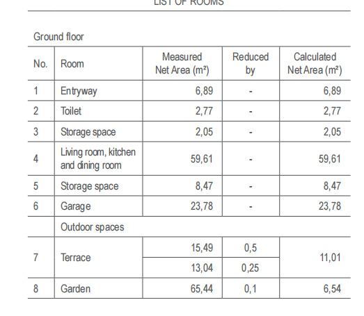 Raspored prostorija:Prizemlje: open-space dnevni boravak s kuhinjom i blagovaonicom (59,61 m²), hodnik, WC, ostava, terasa, vrt (65,44 m²), garaža