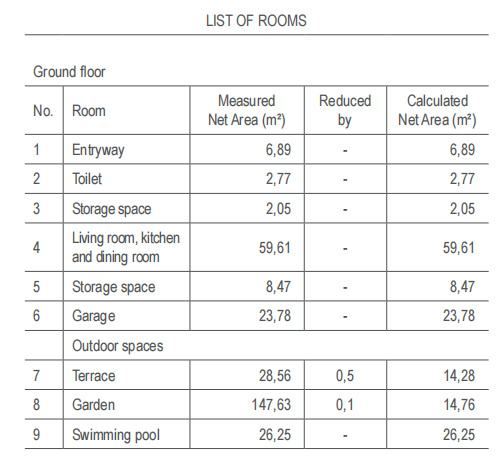 Raspored prostorija:Prizemlje: open-space dnevni boravak s kuhinjom i blagovaonicom (59,61 m²), hodnik, WC, ostava, terasa, vrt (147 m²), garaža
