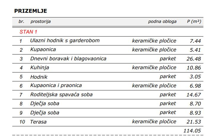Sastoji se od: Ulaznog hodnika s garderobom, kupaonice 1, dnevnog boravka s kuhinjom i blagovaonicom, roditeljske sobe, dječje sobe 1, dječje sobe 2, kupaonice 2 i balkona.