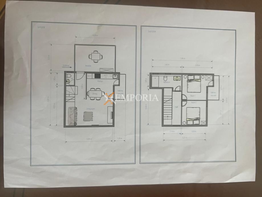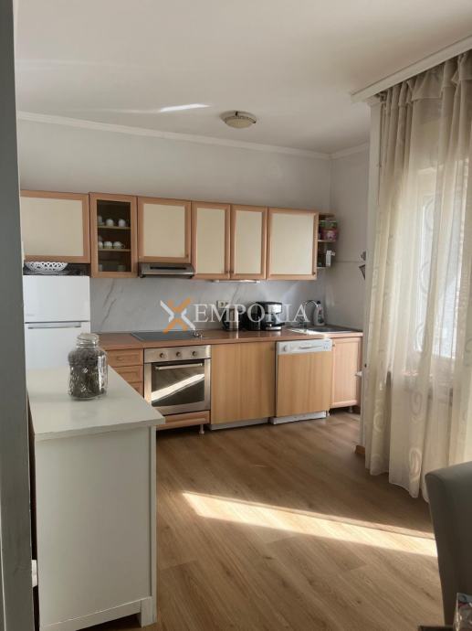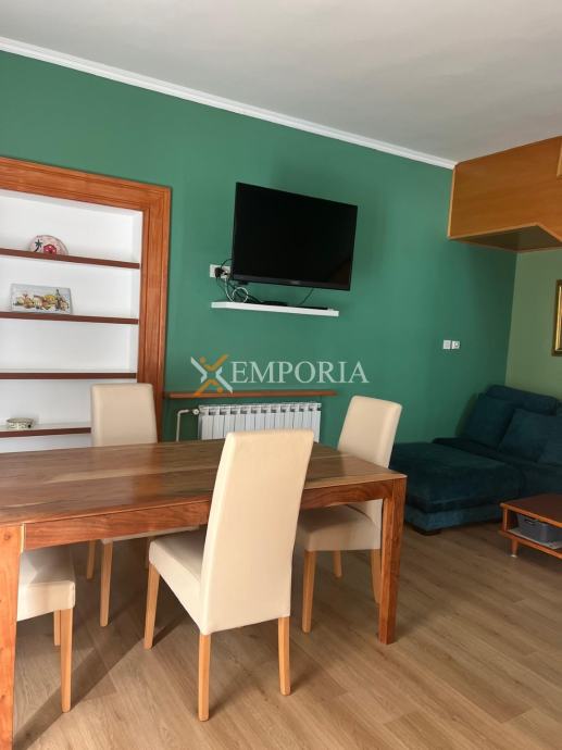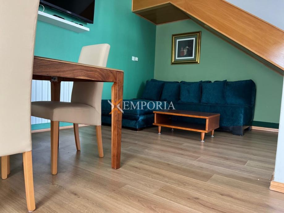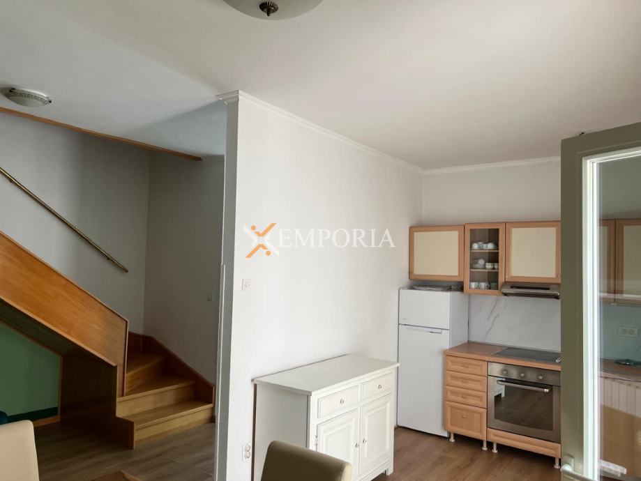 Na prvoj etaži nalazi se natkrivena terasa ispred ulaza u stan, WC te kuhinja s blagovaonicom i dnevnim boravkom u otvorenom konceptu, kao i dodatna natkrivena terasa. Površina ove etaže iznosi 40,72 m². Unutarnje stepenice vode na gornju etažu gdje su smještene dvije spavaće sobe, kupaonica i natkrivena terasa, ukupne površine 35,41 m². Neto korisna površina opisanih prostorija iznosi 76,13 m², dok ukupna neto površina s pripacima iznosi 78,63 m². Stanu pripada jedno parkirno mjesto.OpremaStan se prodaje namješten. Centralno grijanje na plin izvedeno je putem radijatora, a ugrađen je i jedan klima uređaj. Stolarija je drvena s roletama, fasada je toplinski izolirana stiroporom debljine 8 cm, dok su podovi obloženi pločicama i parketom.