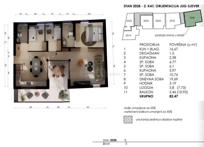 Ovaj stan se nalazi na 2. katu te je dvostrane orijentacije sjever-jug. Sastoji se od ulaznog hodnika, dnevnog boravka s kuhinjom i blagovaonom, 3 spavaće sobe, 2 kupaone i vanjskog dijela - prekrasne terase od 18,65 m2 koja je djelomično natkrivena te daje prostor loggie koja se nastavlja u nenatkriveni balkon.