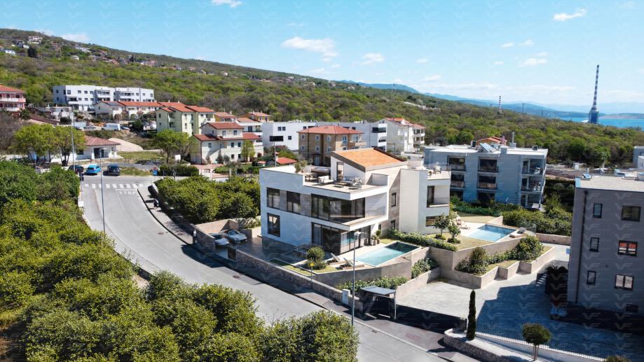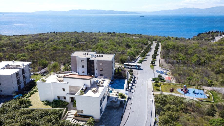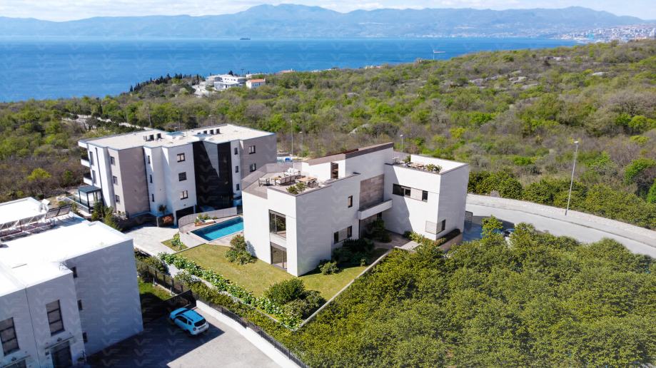 Prodaje se atraktivni apartman u izgradnji, na više etaža u kući sa dva odvojena apartmana, gdje svakom apartmanu pripada okućnica, bazen i parking za dva vozila, na odličnoj uvijek traženoj lokaciji u mirnom i uređenom dijelu Kostrene, blizu obalne šetnice i plaža, orijentiran tako da nudi obilje prirodnog svjetla tijekom cijelog dana. S balkona se pruža fantastičan pogled na more, što ga čini savršenim mjestom za opuštanje tijekom cjele godine. U blizini: trgovine, restorani, kafići i svi drugi potrebni sadržaji