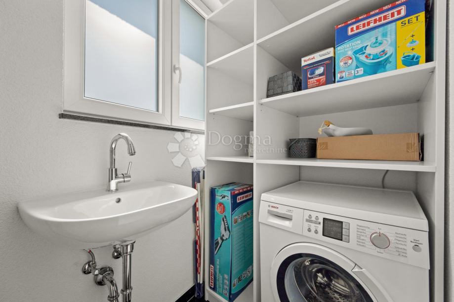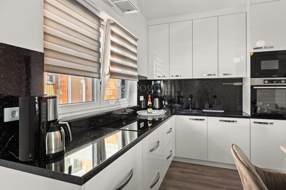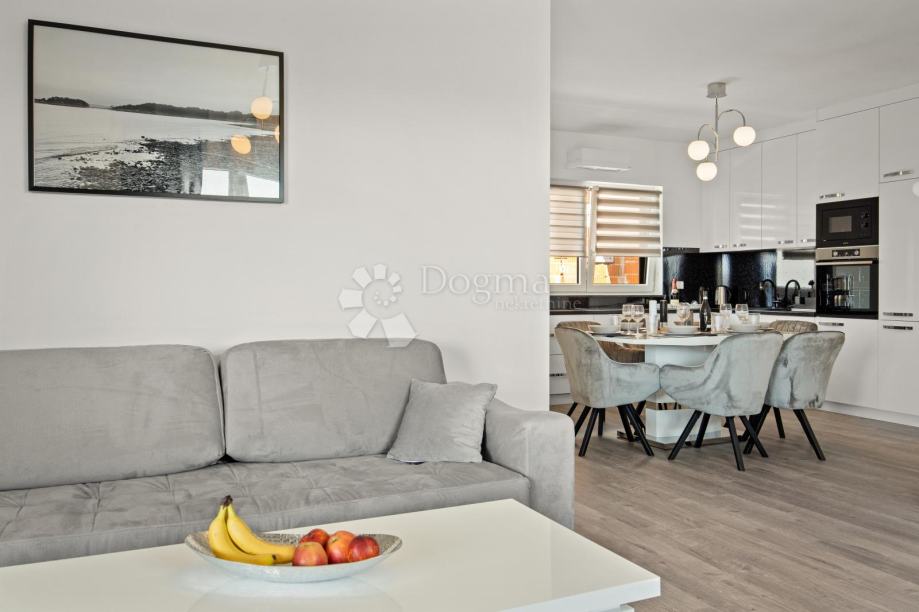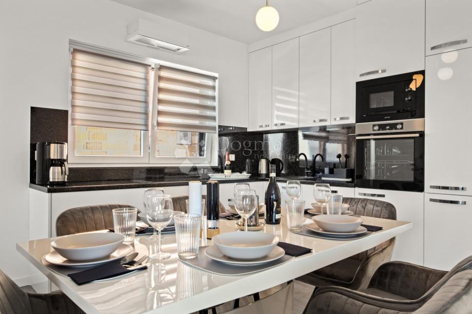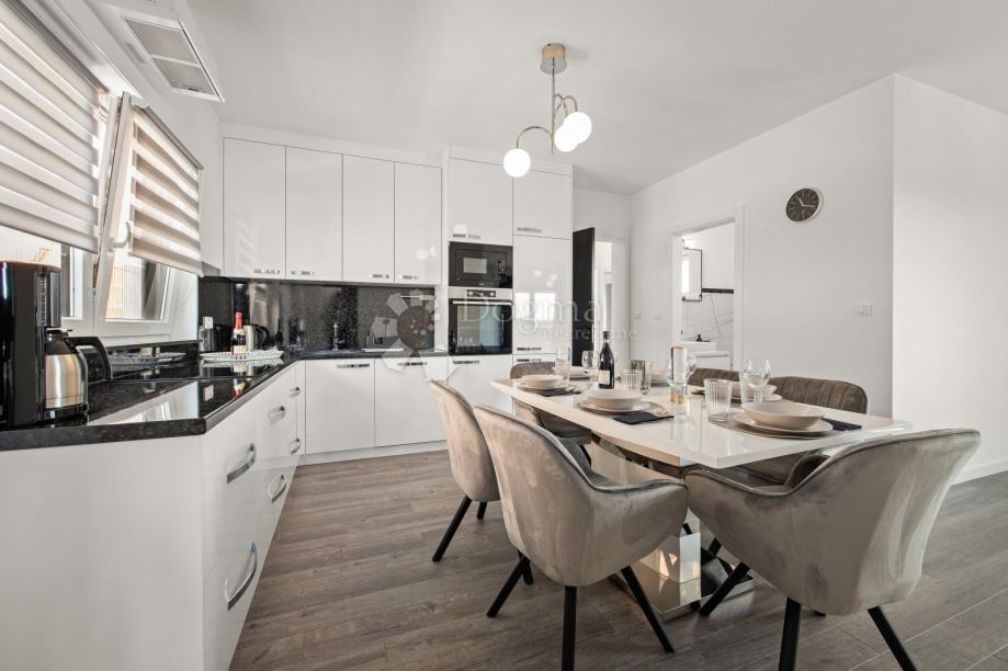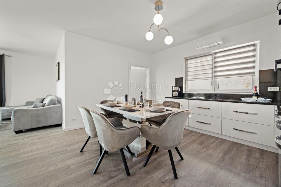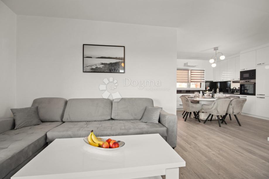 Prozori u dnevnom boravku i spavaćim sobama omogućuju obilje prirodne svjetlosti, dok s terasa i prozora možete uživati u prekrasnom pogledu na more. Otvoreni koncept dnevnog boravka i kuhinje stvara ugodnu atmosferu, idealnu za druženje s obitelji i prijateljima.
