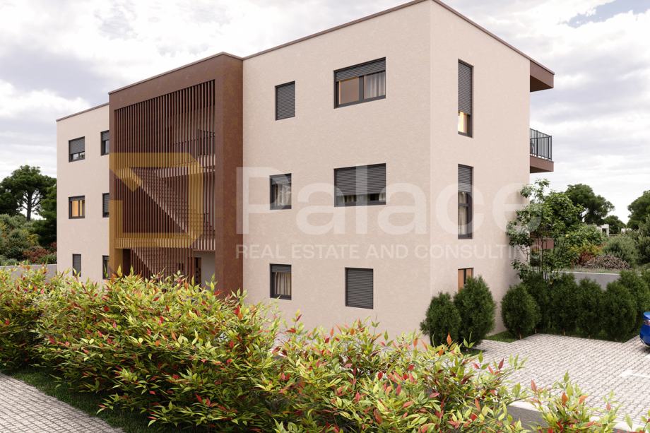 Tlocrt je jednostavan i prostor jako dobro iskorišten. Stambene površine 69,37 m2 te se po ulasku u stan nalazi ulazni prostor površine 7,93 m2 gdje je ostavljen prostor za veliki ugradbeni ormar te vodi do kupaonice površine 5,37 m2, te dvije spavaće sobe površine 12,01 m2 i 10,89 m2 i prostora kuhinje, dnevnog boravka i blagovaonice površine 33,76 m2. Kuhinja može biti odvojena vratima ukoliko ima potrebe za tim. Iz dnevnog boravka se izlazi na natkrivenu terasu površine 10 m2 ( izračun po koeficijentu 5 m2 ). Stanu pripadaju i dva nenatkrivena parkirna mjesta ( izračun po koeficijentu 5 m2 ).