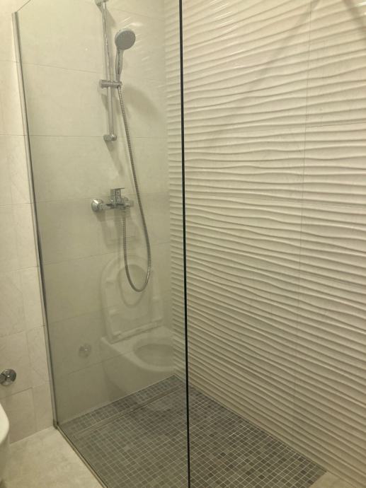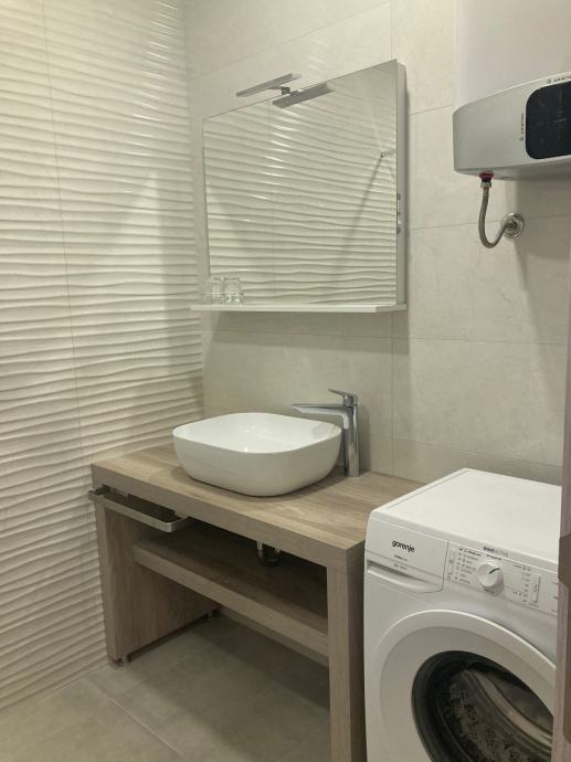 Stan je opremljen podnim grijanjem i klima jedinicama u sobi I boravku. Ima perilicu rublja i TV. Kuhinja u potpunosti opremljena – frižider, štednjak, pećnica, perilica….