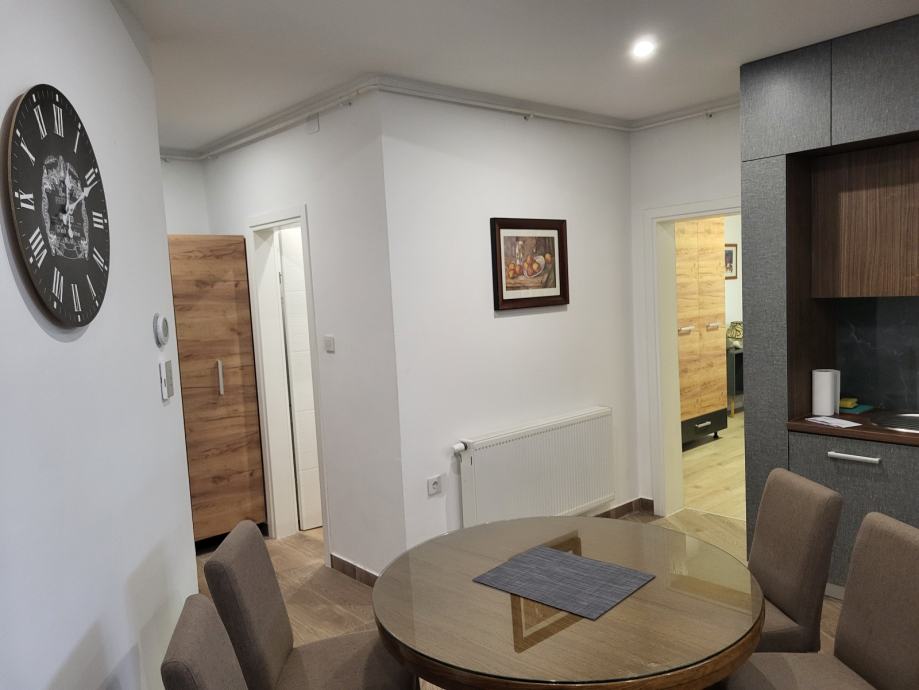 Stan se sastoji od otvorenog prostora dnevnog boravka s kuhinjom i blagovaonicom ,1 spavaća soba, kupaonicom , Iisključivo 1 parkigo mjesto (ako imate dodatno vozilo može se koristiti javni parking preko puta zgrade) .