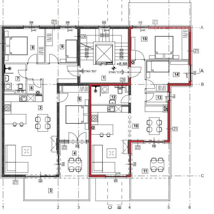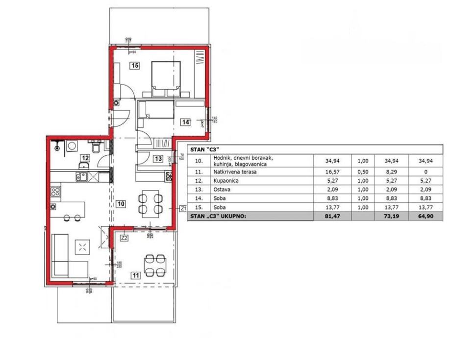 Stan neto korisne površine 73,19 m2 sastojati će se od hodnika, dnevnog boravka, kuhinje, blagovaonice, kupatila, ostave, dvije spavaće sobe i natkrivene terase.