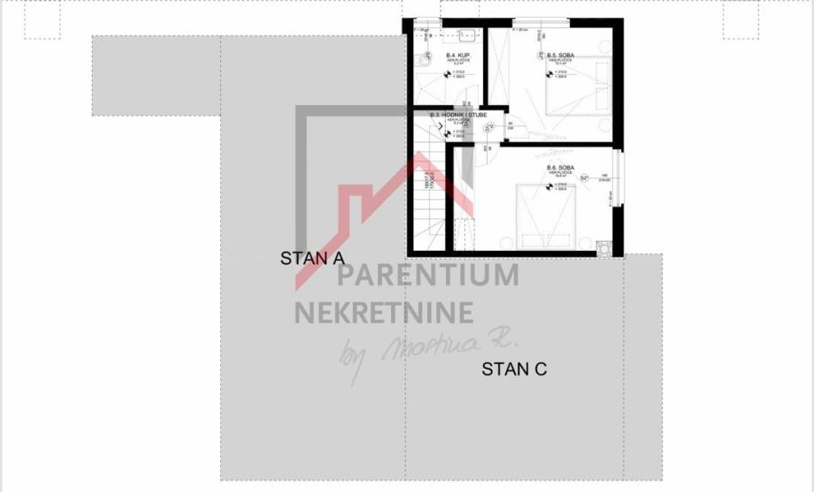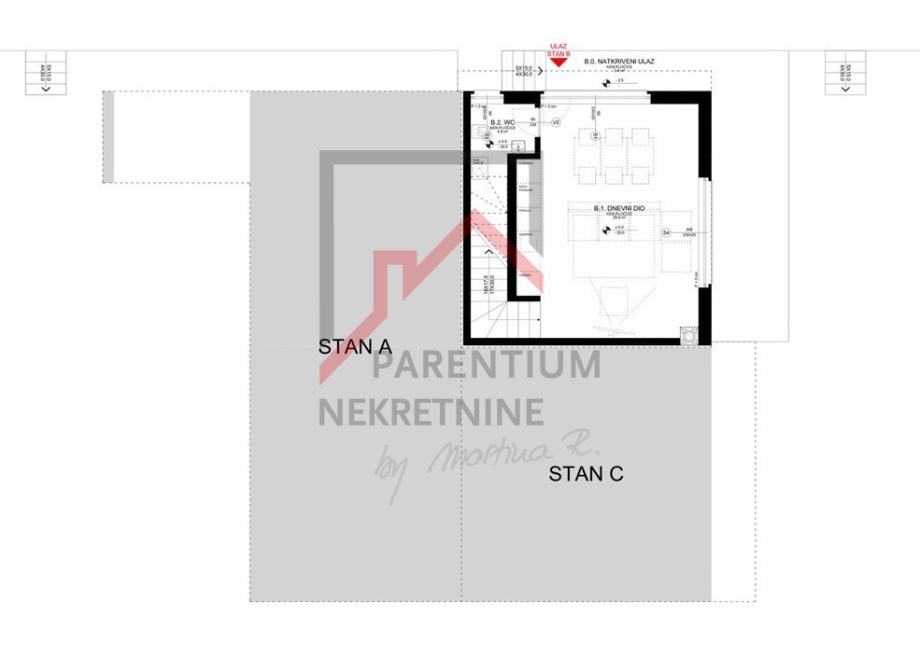 Stanu pripada dio dvorišta od cca 53m2. Stanu pripada parkirno mjesto od 16m2.