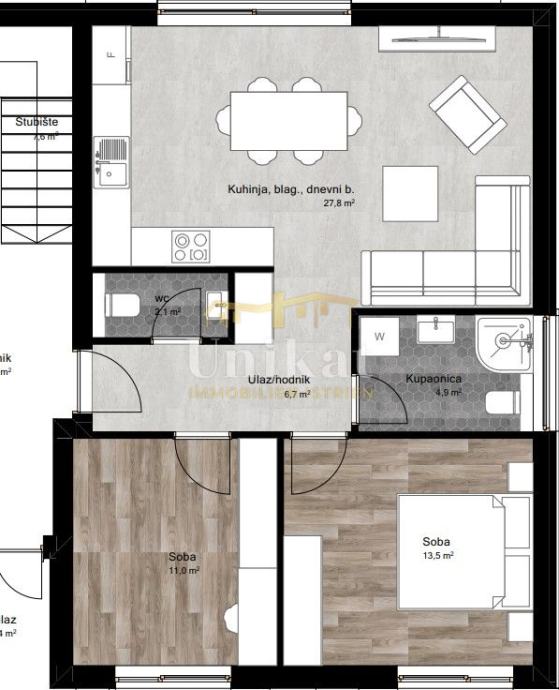 Ovaj stan nalazit će se u prizemlju i sastojat će se od ulaznog prostora, dnevnog boravka s kuhinjom i blagovaonom, wc-a, dvije spavaće sobe i kupatila.