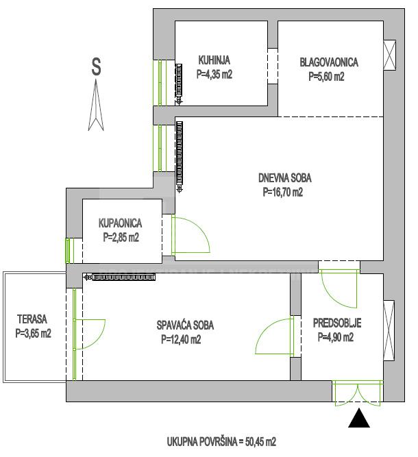 Stan se sastoji od predsoblja, dnevne sobe s blagovaonicom, izdvojene kuhinje, spavaće sobe s izlazom na terasu te kupaonice. Ukupne površine 50 m2, a pripada mu i podrumska ostava površine od gotovo 17 m2.