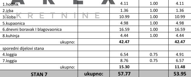 hodnika, izbe, sobe, kupaonice, dnevnog boravka s blagovaonicom i kuhinja površine 42,47 m2, s dvije loggie površine 6,54 m2 i 8,76 m2 m2; a kojem pripada: spremište (u prizemlju, oznake spremište 1) površine 2,33 m2 i vanjsko parkirališno mjesto (oznake S7-P9) površine 12,50 m2