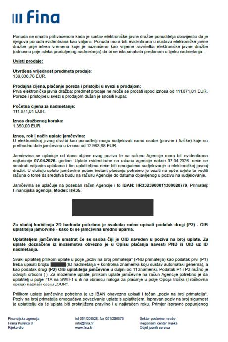 Početna cijena na dražbi iznosi 111.871,01 EUR.