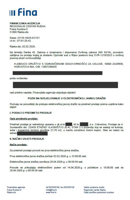 Pozivaju se svi zainteresirani kupci da pristupe EJD na stranicama FINA-e, a dražbovanje je zakazano za period od 14.4.2026.-28.4.2026. godine.