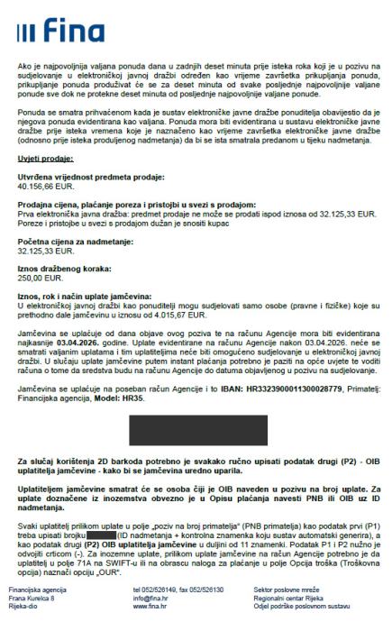 Početna cijena na dražbi iznosi 32.125,33 EUR.