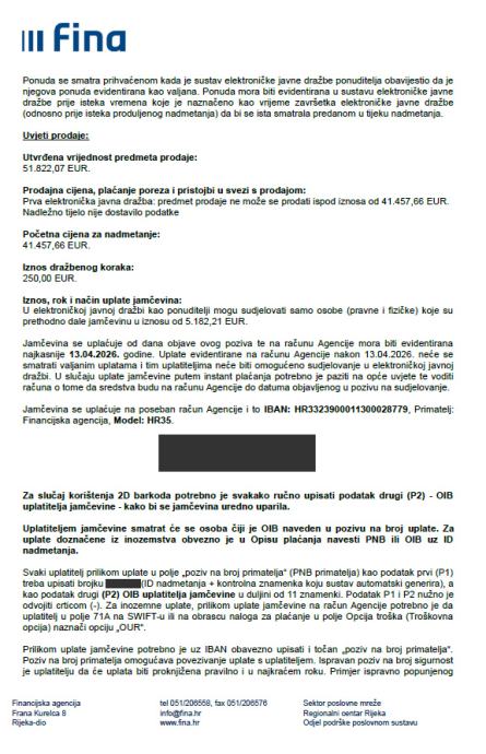 Početna cijena na dražbi iznosi 41.457,66 EUR.