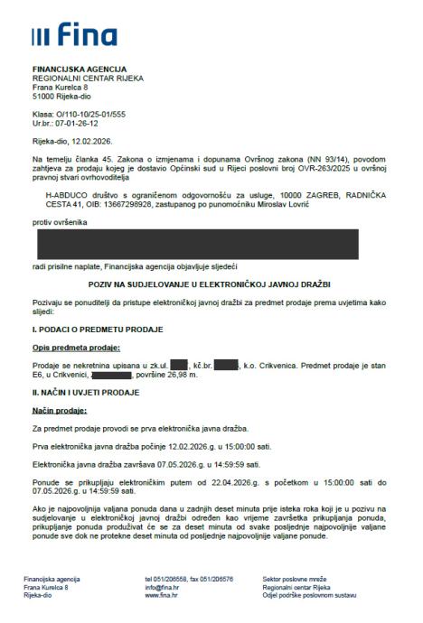 Pozivaju se svi zainteresirani kupci da pristupe EJD na stranicama FINA-e, a dražbovanje je zakazano za period od 14.4.2026.-28.4.2026. godine.