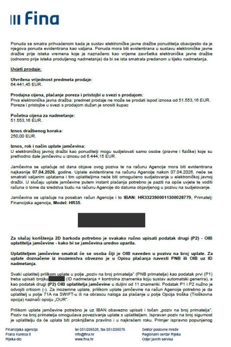 Početna cijena na dražbi iznosi 51.553,16 EUR.