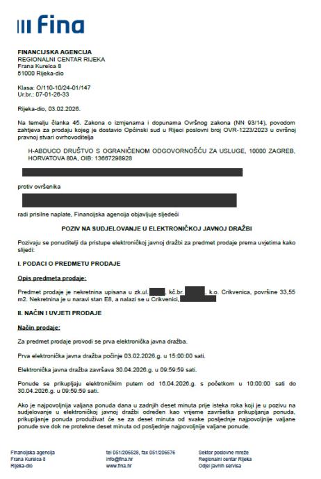 Pozivaju se svi zainteresirani kupci da pristupe EJD na stranicama FINA-e, a dražbovanje je zakazano za period od 14.4.2026.-28.4.2026. godine.