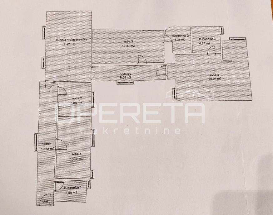 Ovaj šarmantni stan sastoji se od četiri spavaće sobe, od kojih su tri prostrane i jedna manja, tri kupaonice s toaletom, kuhinje s blagovaonicom te dva hodnika koja povezuju prostor u logičnu i funkcionalnu cjelinu.