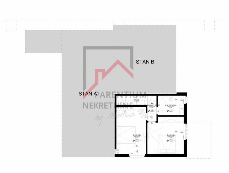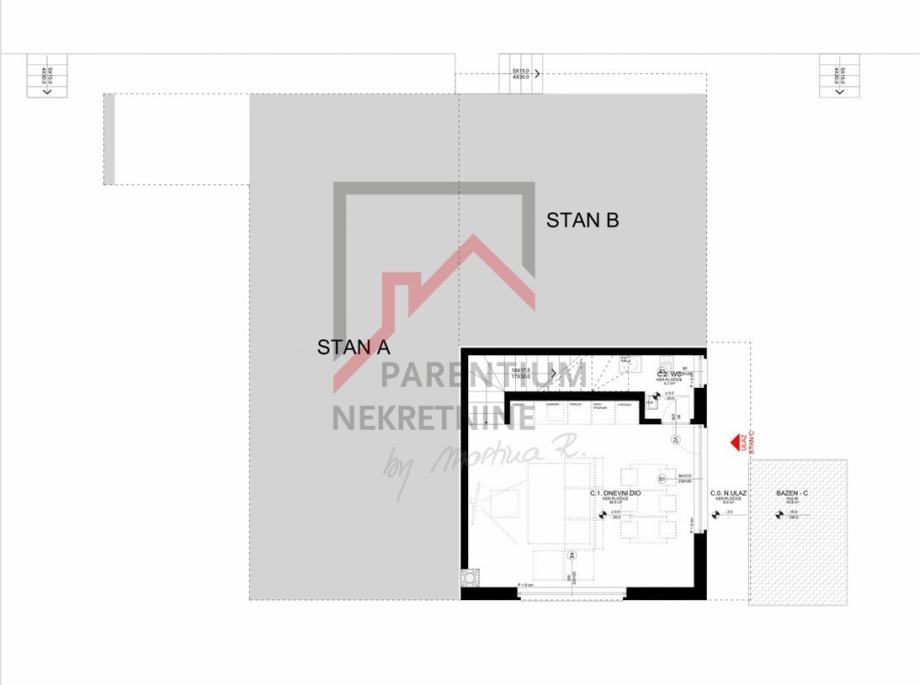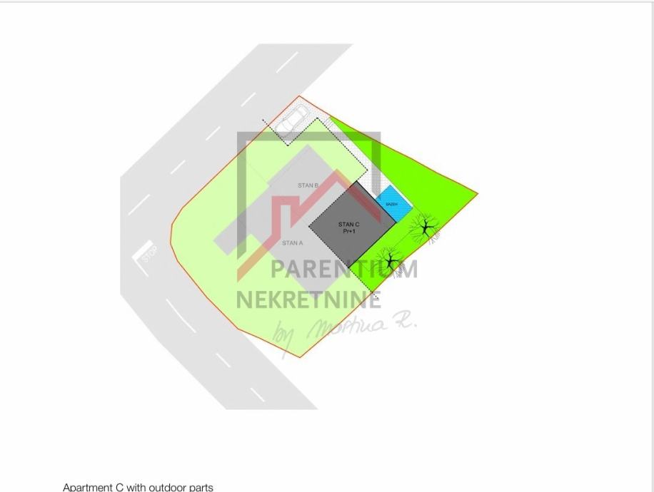 Stanu pripada dio dvorišta, gdje će biti smješten bazen. Stanu pripada parkirno mjesto od 19m2.