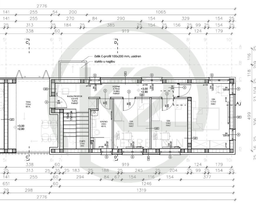 Podovi u dnevnom boravku i spavaćim sobama dvoslojnim hrastovim parketom debljine 14mm.