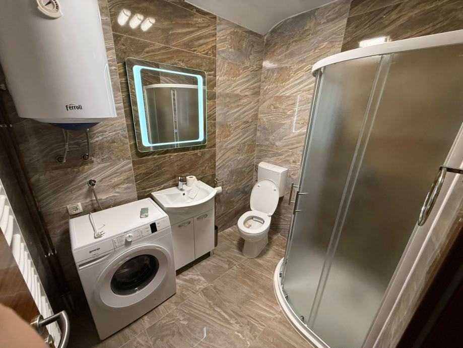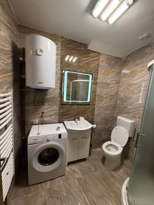 Stan ima novo uređenu kupaonicu s WC-om, opremljenu perilicom rublja. Prostrani dnevni boravak povezan je s potpuno opremljenom kuhinjom, a iz dnevnog boravka se izlazi na balkon.