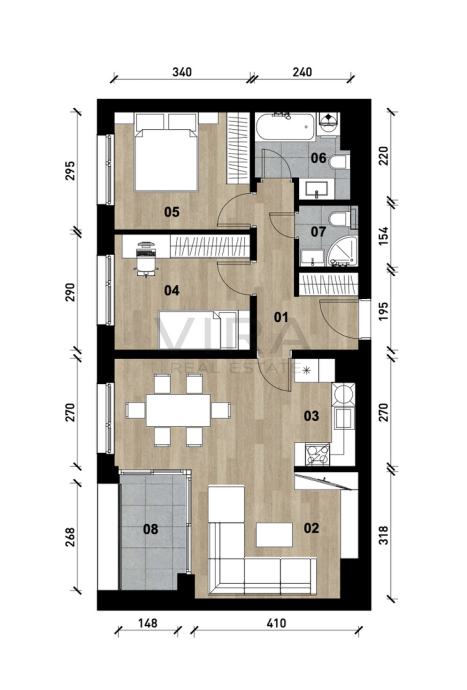 Stan se sastoji od dnevnog boravka, kuhinje, 2 spavaće sobe, 2 kupaonice s wc-om, hodnika i loggie.