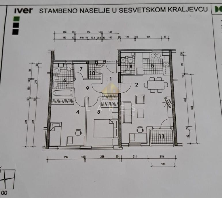 Sastoji se od hodnika, dnevnog boravka, dvije spavaće sobe, blagovaonice, kuhinje, kupaonice, wc-a, dvije ostave,lođe i spremišta u zgradi.