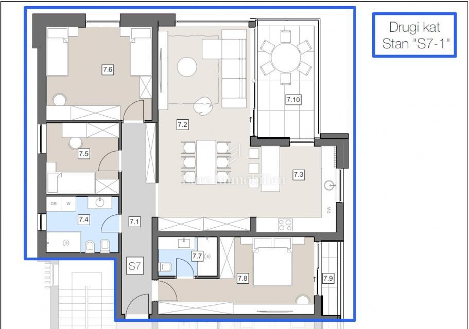 Stan površine 111.67 m² sastoji se od kuhinje, blagovaonice i dnevnog boravka otvorenog koncepta, hodnika, dvije kupaonice, tri spavaće sobe te natkrivene i nenatkrivene terase.