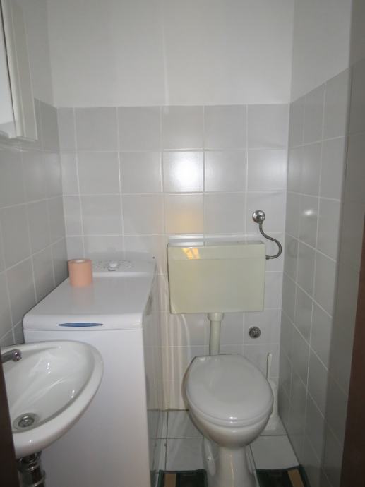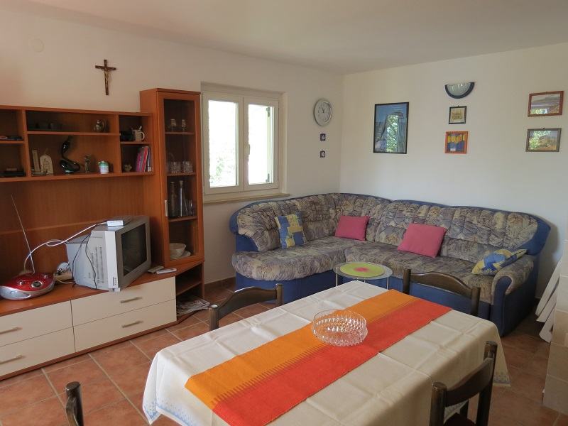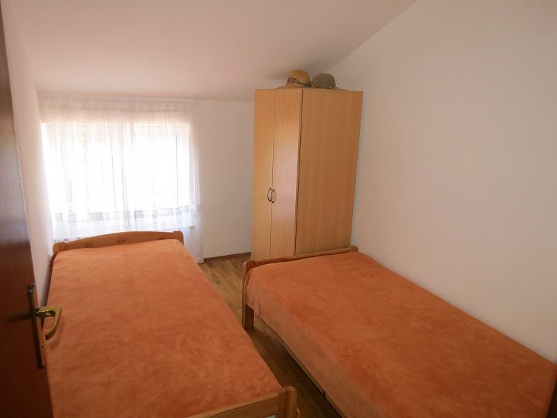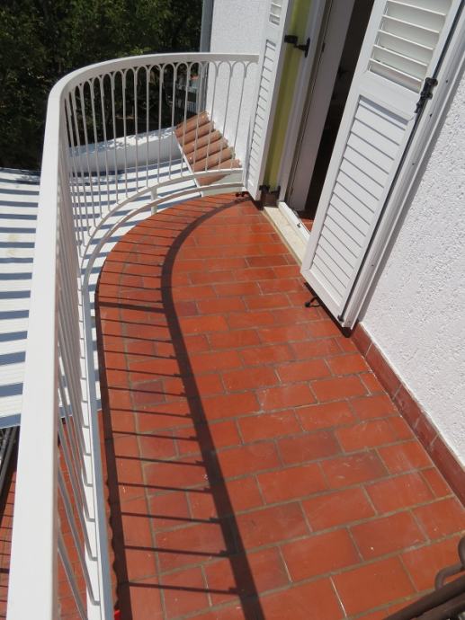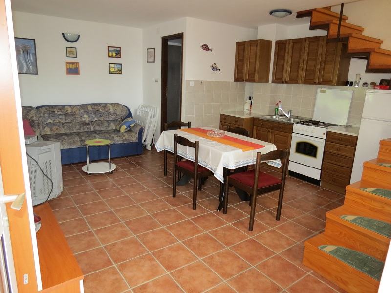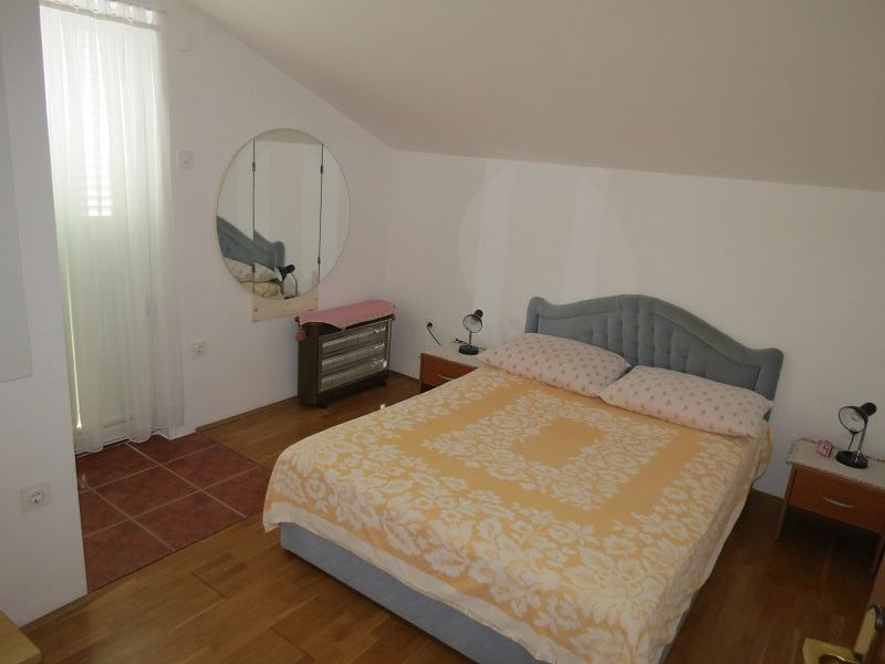 Udaljen od plaže svega 200m prodaje se dvoetažni apartman pozicioniran na I. katu zgrade. U donjem dijelu stambenog prostora nalaze se kuhinja, dnevni boravak i kupaona dok su u gornjem dijelu smještene dvije spavaće seobe i kupaona. Vlasnicima pripada pravo korištenja vanjskog prostora namjenjenog roštiljanju u 1/2 ukupnog dijela odnosno 25 m2. Iz gornje terase pruža se predivan pogled na more.